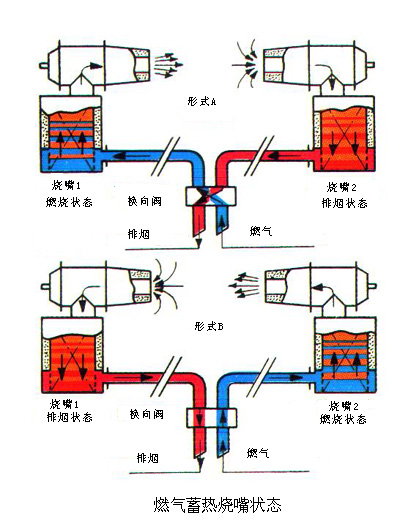 Energy-saving regenerative combustion technology The working principle of regenerative burner is as shown below. The normal temperature air is sent by the fan into the regenerative burner B through a switch valve and heated up when passing through it, with temperature approaching the hearth temperature (usually about 50¡«100¡ælower than the hearth temperature) in a very short time. After the air at a high temperature gets into the hearth, because of mixing with the flue gases in the hearth, it forms an airflow which is rarefied, oxygen-diluted and at high temperature and whose oxygen content is much lower than 21%. At the same time the fuel (fule oil or gas) is injected into the formed airflow and the fuel burns in the little oxygen condition (2~20%). Meanwhile, the hot flue gases burning in the hearth stores the heat energy in the burner A when it passes through it, and then the flue gases whose temperature is lower than 150¡æ is removed through the switch valve. The switch valve which can change the flow direction at not very high working temperature switches with a stated frequency, and it makes two burners working alternatively for store-up and release of heat, so as to save energy and reduce the quantity of NOX discharge. The switch cycle in common use is 30~200s. Energy-saving regenerative technology can be used for many types of furnaces, such as Bogie hearth furnace, Walking furnace, Pusher type furnace, Chamber furnace, Rotary hearth furnace and so on.